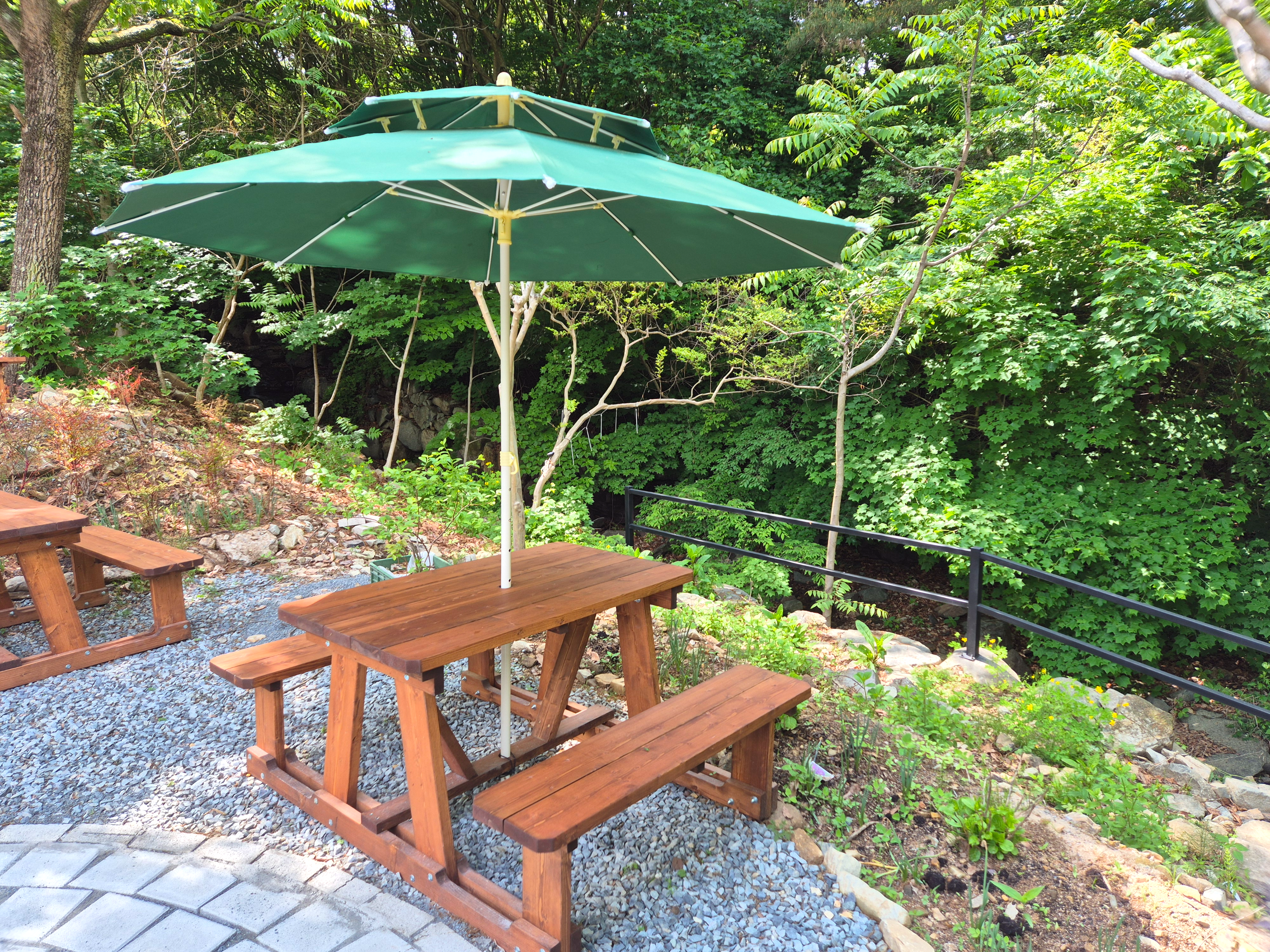 날씨가 좋을 때는 숲 속 피톤치드를 느끼며 야외에 앉으면 좋을 것 같아요.