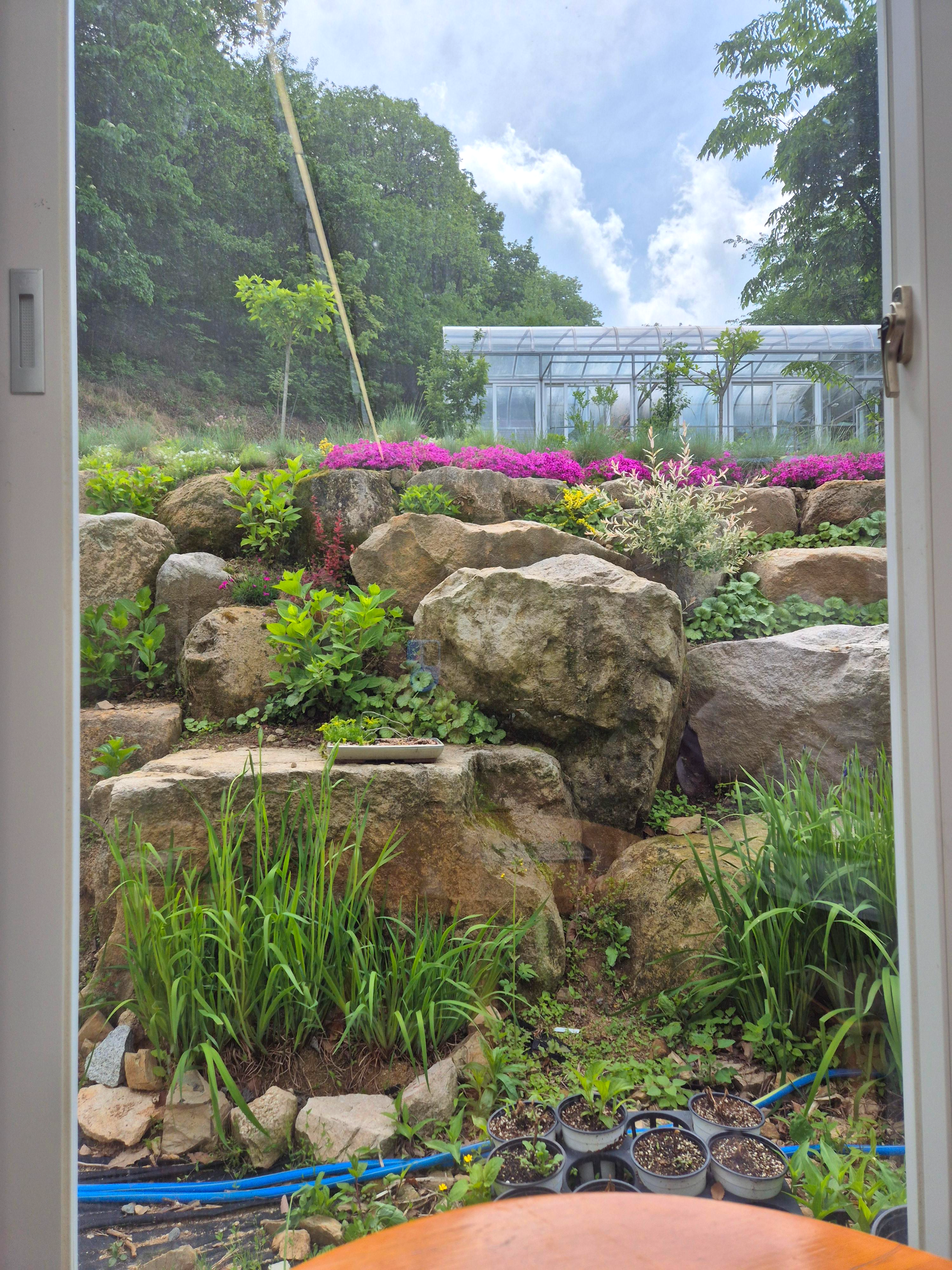 온실 오른 편에 앉으면 꽃 정원이 보이고