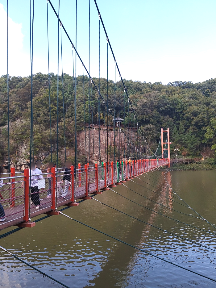 입곡군립공원 내에는 여러 명소가 있어요. 그중에서도 특히 추천하는 곳은 바로 출렁다리입니다. 사진에서 보실 수 있는 이 다리는 강을 가로지르며, 주변의 아름다운 경치를 한눈에 담을 수 있는 최고의 포인트에요. 다리를 건너면서 느끼는 바람과 함께하는 경치는 정말 잊지 못할 경험이랍니다. 그리고 저는 이 다리를 건널 때 물가에 부표 근처에서 놀고 있는 수달이나 거북이를 본 적이 있어요. 가보신다면 한 번 건너면서 있는지 보시면 좋을 것 같아요!