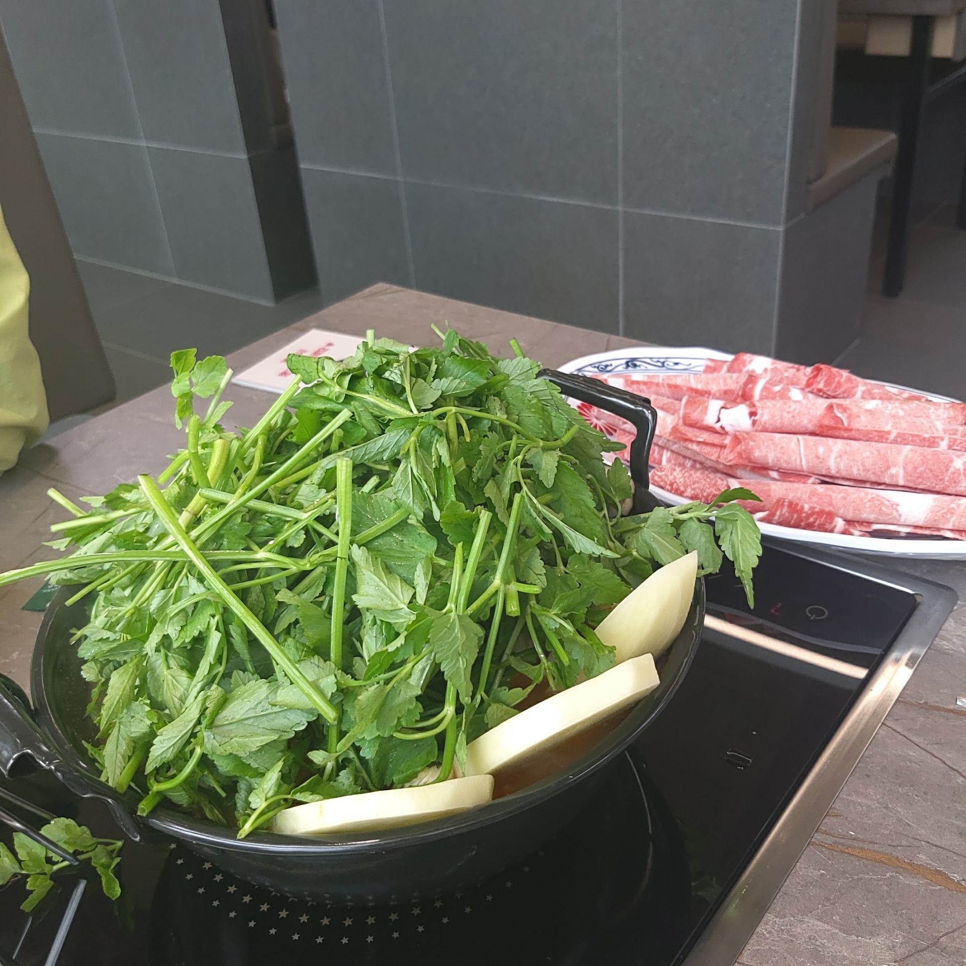 저는 얼큰미나리버섯전골(한우)을 주문했는데 주문한 음식이 나왔을 때, 산처럼 쌓인 미나리 비주얼이 정말 좋았어요.
