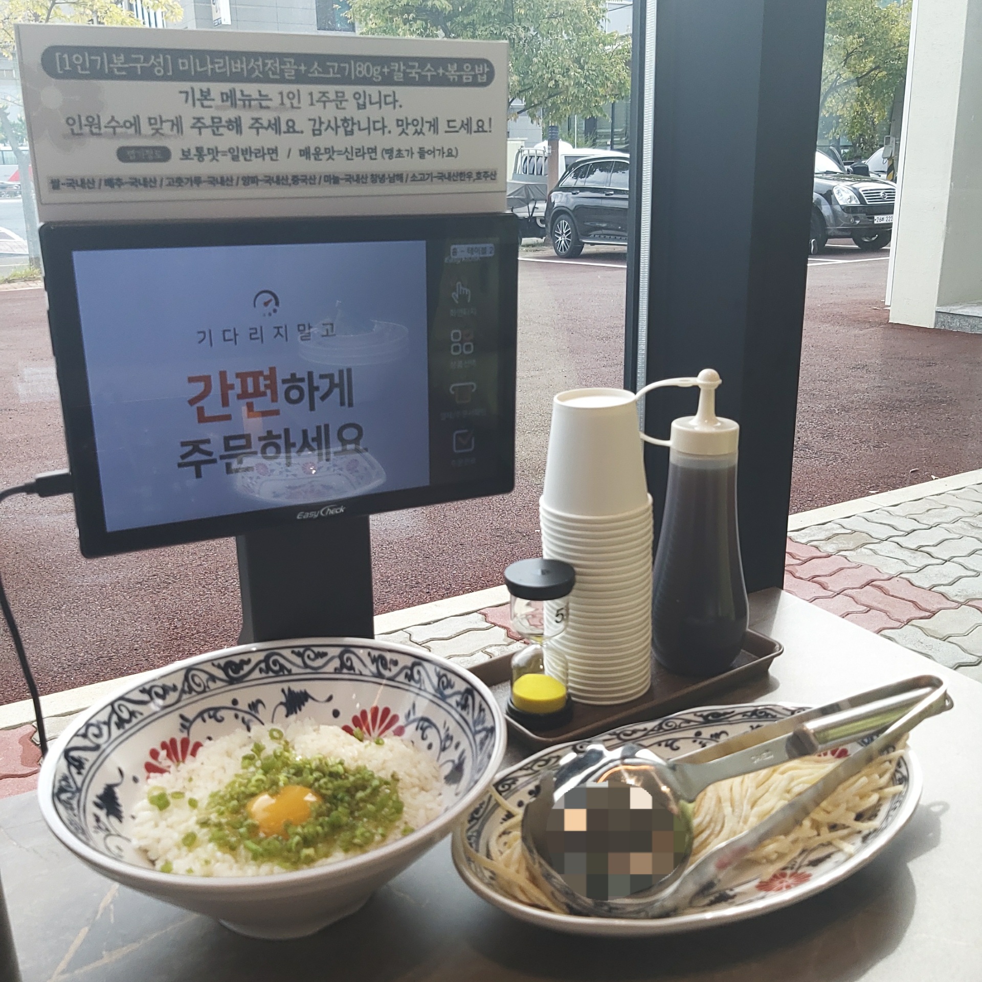 처음에 들어왔을 때 칼국수랑 죽, 김치를 세팅해주시는데 칼국수는 전골 먹다가 넣어 먹으면 되고 죽은 키오스크로 직원분께 만들어달라고 하면 가져가서 만들어주셔요.