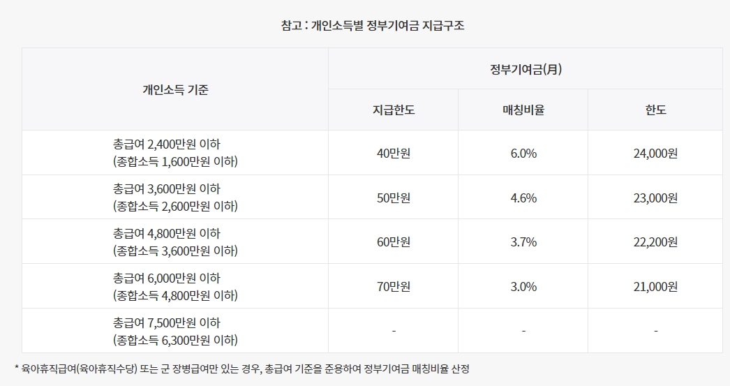 소득에 따라 매달 최대 70만 원까지 저축할 수 있으며, 정부에서 3%에서 6%의 지원금을 추가로 받을 수 있어요.