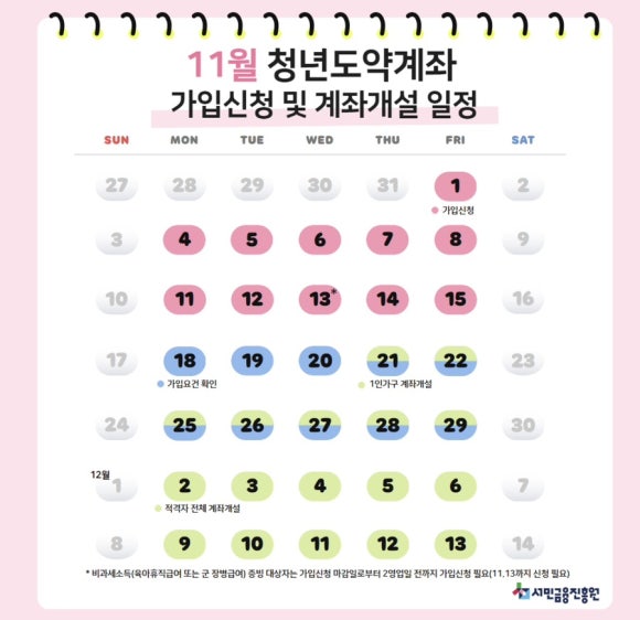 202411월 청년도약계좌의 가입 신청은 11월 1일~15까지이며 계좌개설 일정은 아래 사진을 참고해주세요.