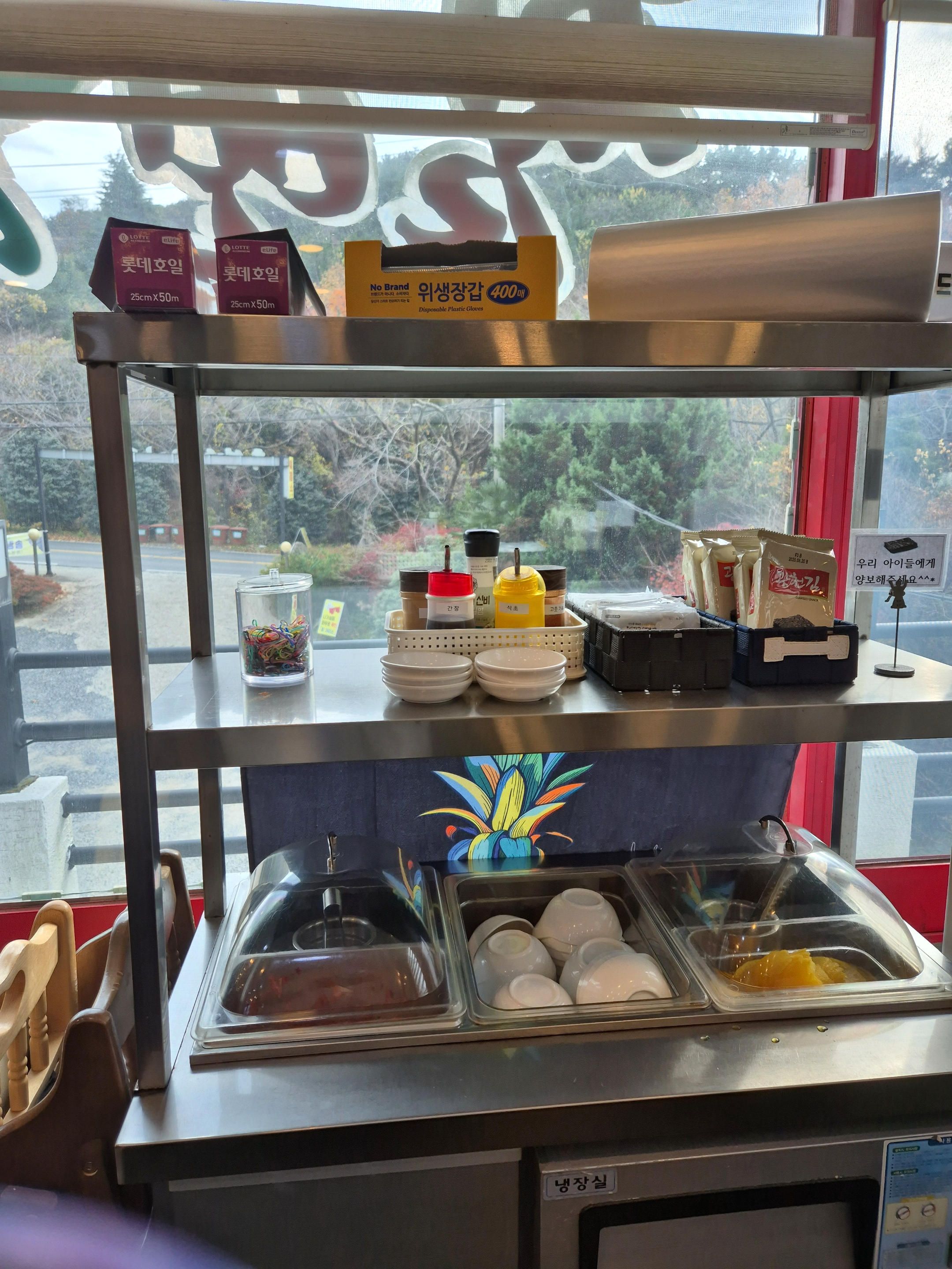김치와 단무지, 김도 무료로 제공하고 남은 음식을 편하게 싸갈 수 있도록 비닐과 은박지도 구비되어있어요.